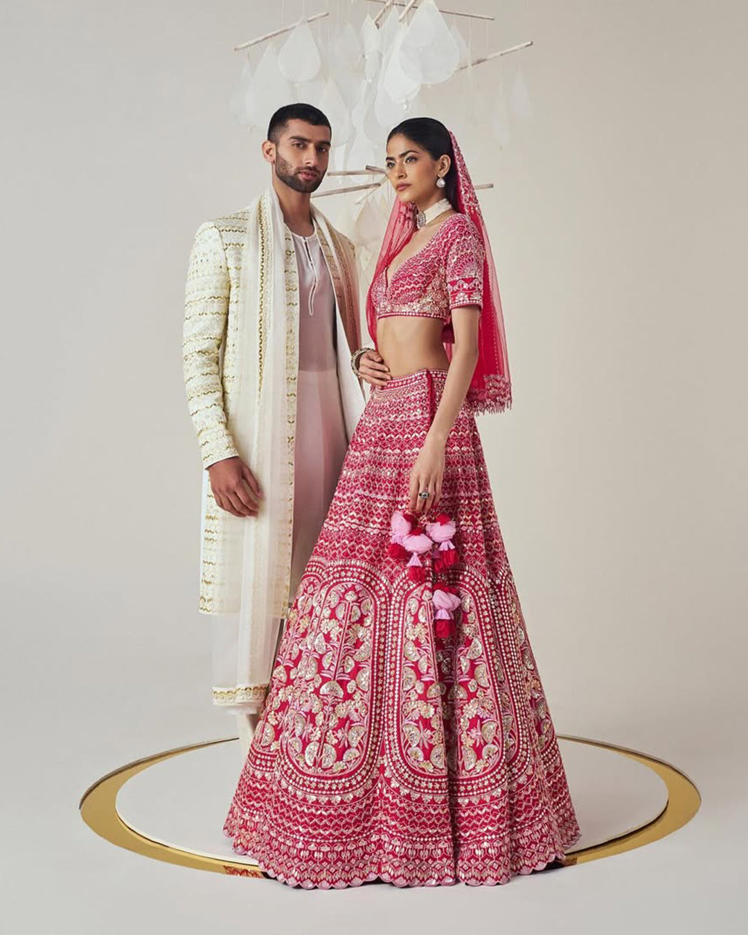 Exquisitely stitched broad neckline blouse delicately embroidered with beads and sequins paired with a floral pearl print pleated lehenga featuring a delicate cutwork at the hem. To complete the look this set comes with a beautifully embroidered dupatta with gold gota border and sequin flowers.