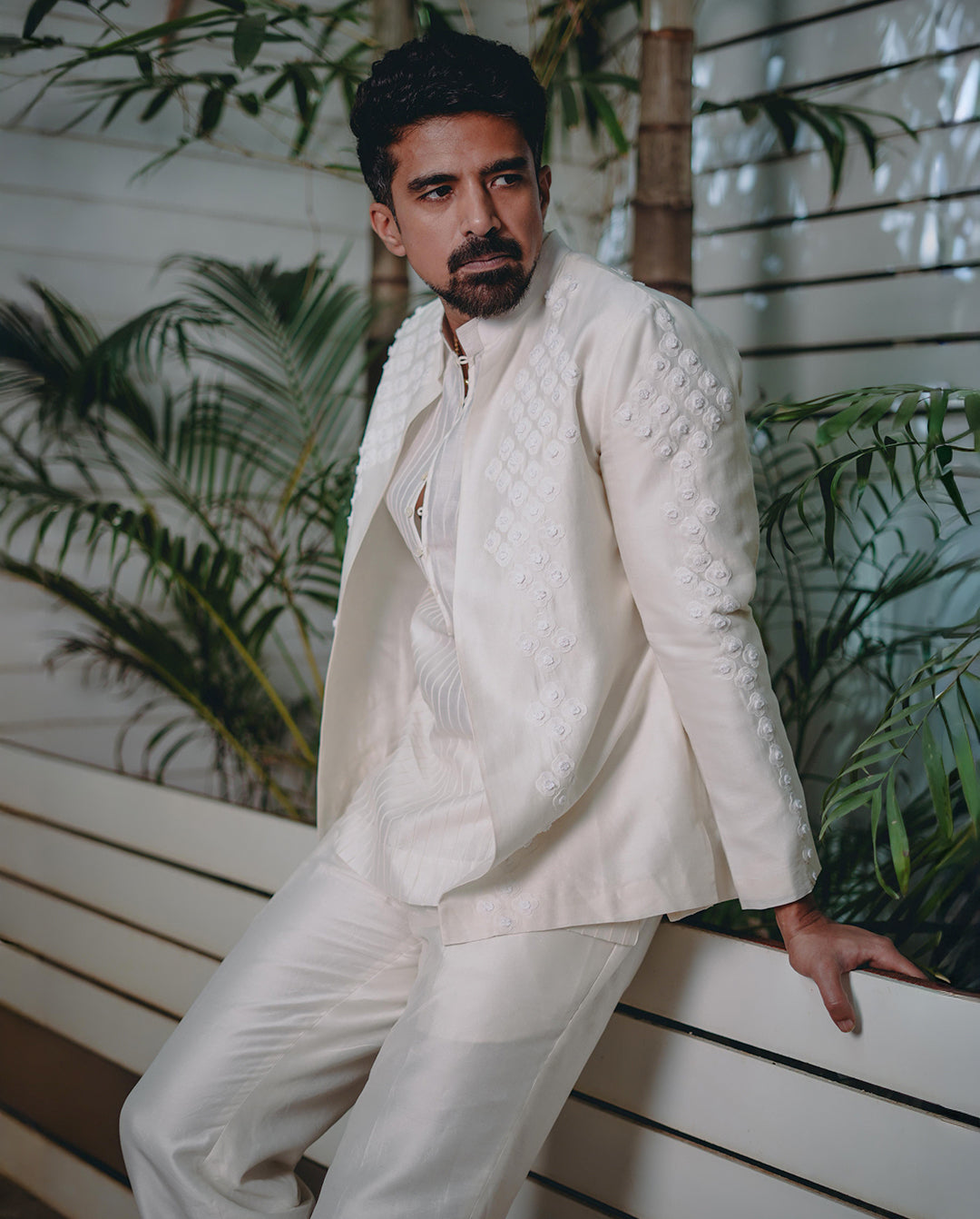 This silk chanderi Jacket and Kurta captivate with its subtle interplay of textures. The double layer chanderi jacket is light and breathable, perfect for summers. The 3D floral motifs are cleverly placed, adding an edge to this classic look. The kurta has delicate pintucks cascade down the front, punctuated by intricate dhagai work at the collar and cuffs. A sleek silk neckline provides a counterpoint, creating a piece that exudes elegance. Go with a all chanderi look and pair it with a chanderi silk pant or a simple ivory trouser.