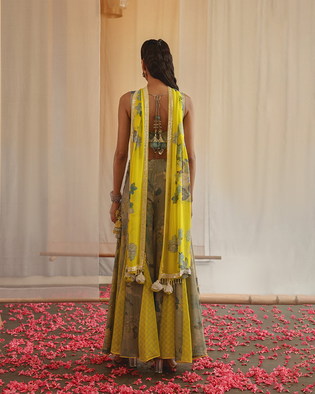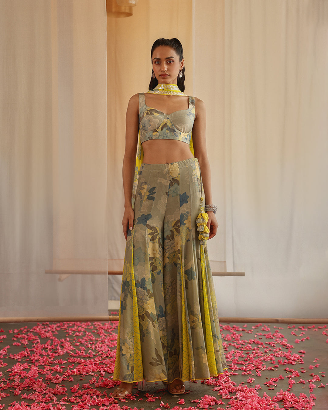 The Marigold Mist Set pairs freshness with ease. A structured corset top meets a breezy sharara in earthy blue print, finished with contrasting polka godets that add movement and charm. A lightly embroidered silk stole completes the look—effortlessly festive, modern, and full of joy.
