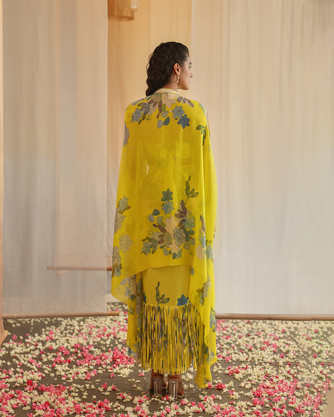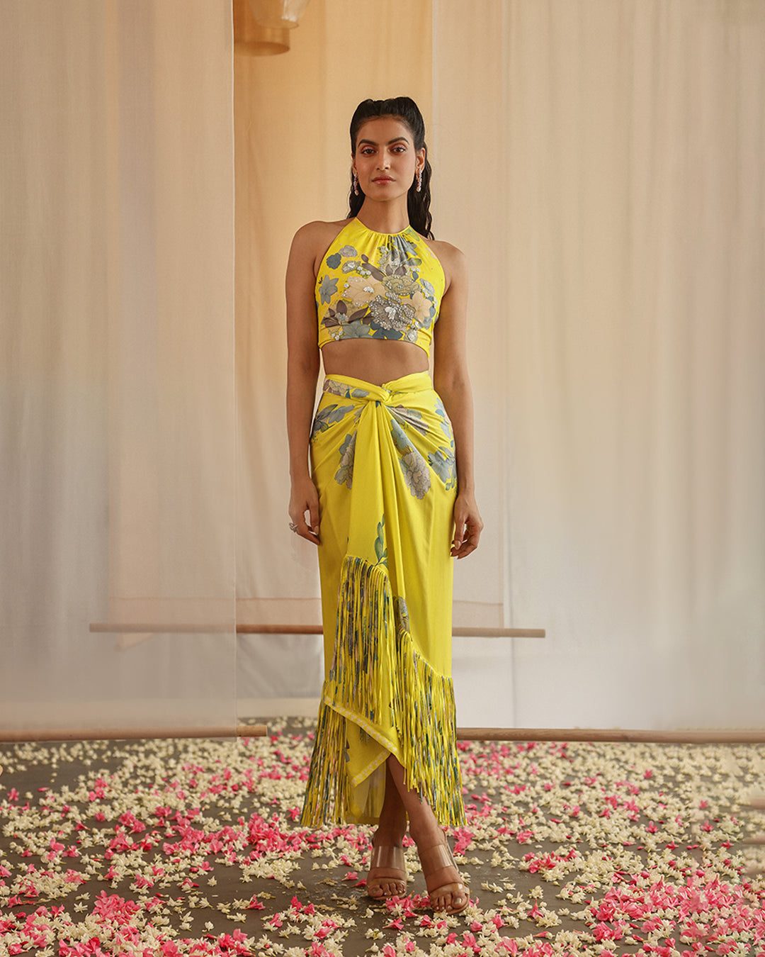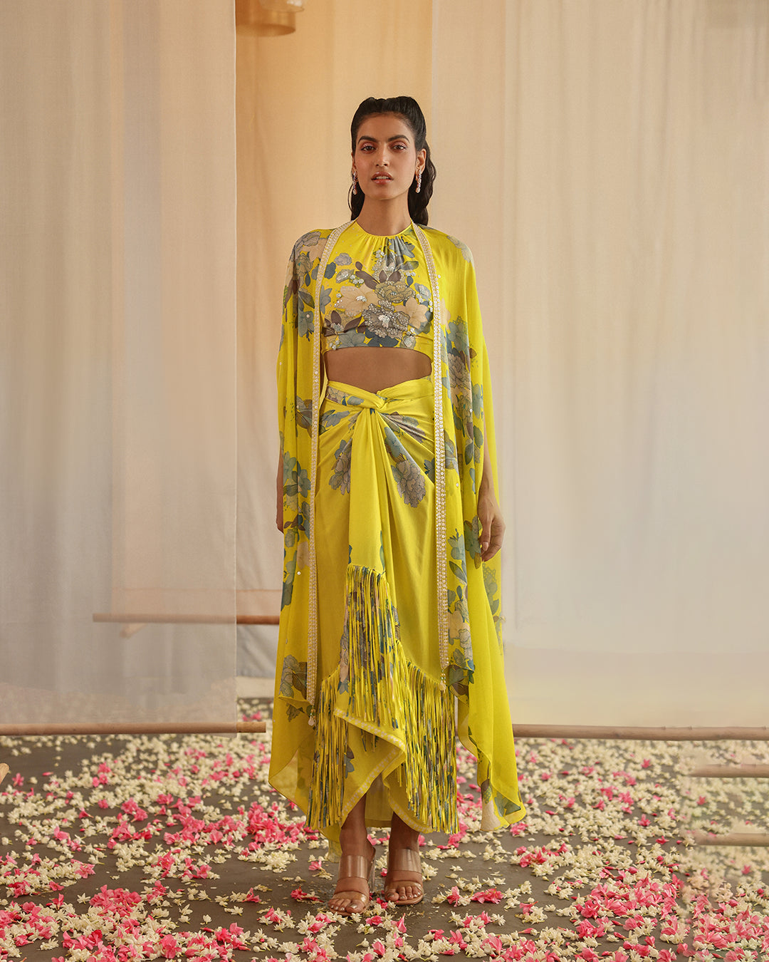 Crafted in our Oriental Bloom print, this look features the signature twist-wrap fringe skirt paired with a halter blouse delicately accented with sequins. A fluid silk cape with a sequin-edged border replaces the traditional dupatta, adding movement and versatility. Vibrant, youthful, and effortlessly chic—perfect for celebrations that call for comfort and statement in equal measure.